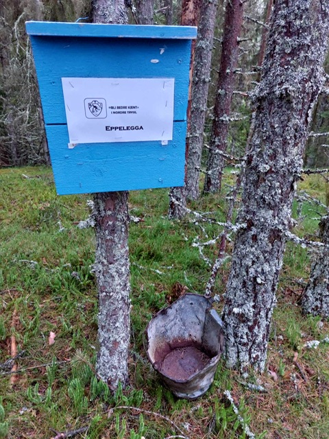 Kort og lettgått tur markert med gule bånd starter ved parkeringen oppe ved skola, gå stien som man går opp til Bristolkoia i ca 130m, der står en stor tall med en grønn fuglekasse på, ta til venstre gå 30m så er du ved kassa, fort gjort sa elgen som datt i fangstgropa😃