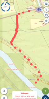 Gå veien videre ned til sjøen. Når du kommer ned til vannet, går du til venstre, over brua, og fortsetter veien på andre siden mot demningen hvor kassa henger. Kan være noe bløtt i veien ned til sjøen, men ikke noe problem. Ca 500 - 600 m å gå.