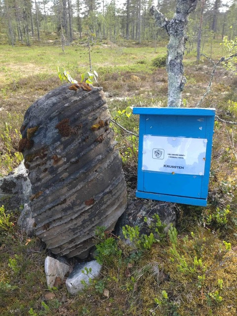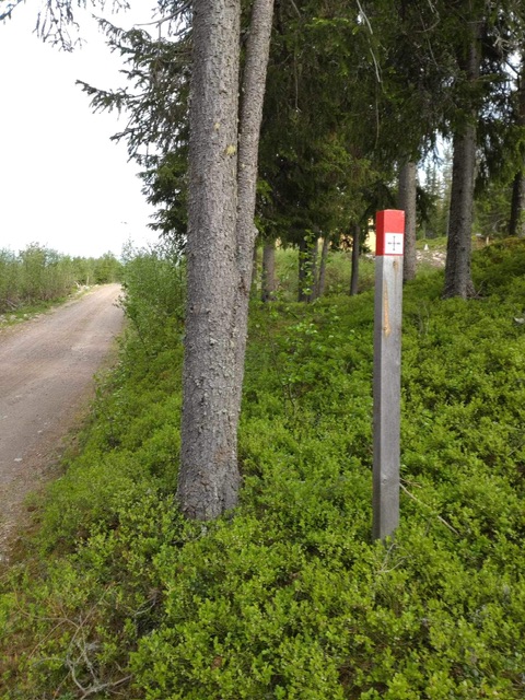 Gå veien sørover mot Løvås, etter ca 150 m tar stien av til høyre, den er merket med pilgrimsmerket og blå maling. Stien går innpå en grus/skogsbilvei en liten bit, før stien går videre langs jordet på Løvås, i enden av jordet, og rett før bekken, tar stien til venstre, etter noen meter tar den til høyre og over bekken der. Ikke vær bekymret om det er lite blå bånd, da dette er en veldig synlig og lettgått sti, som er merket med blåmaling og pilgrimsmerket hele veien. Etter ca 2 km er du framme ved krussten. Ett par bløte steder, men går du litt ut av stien, går det veldig fint.