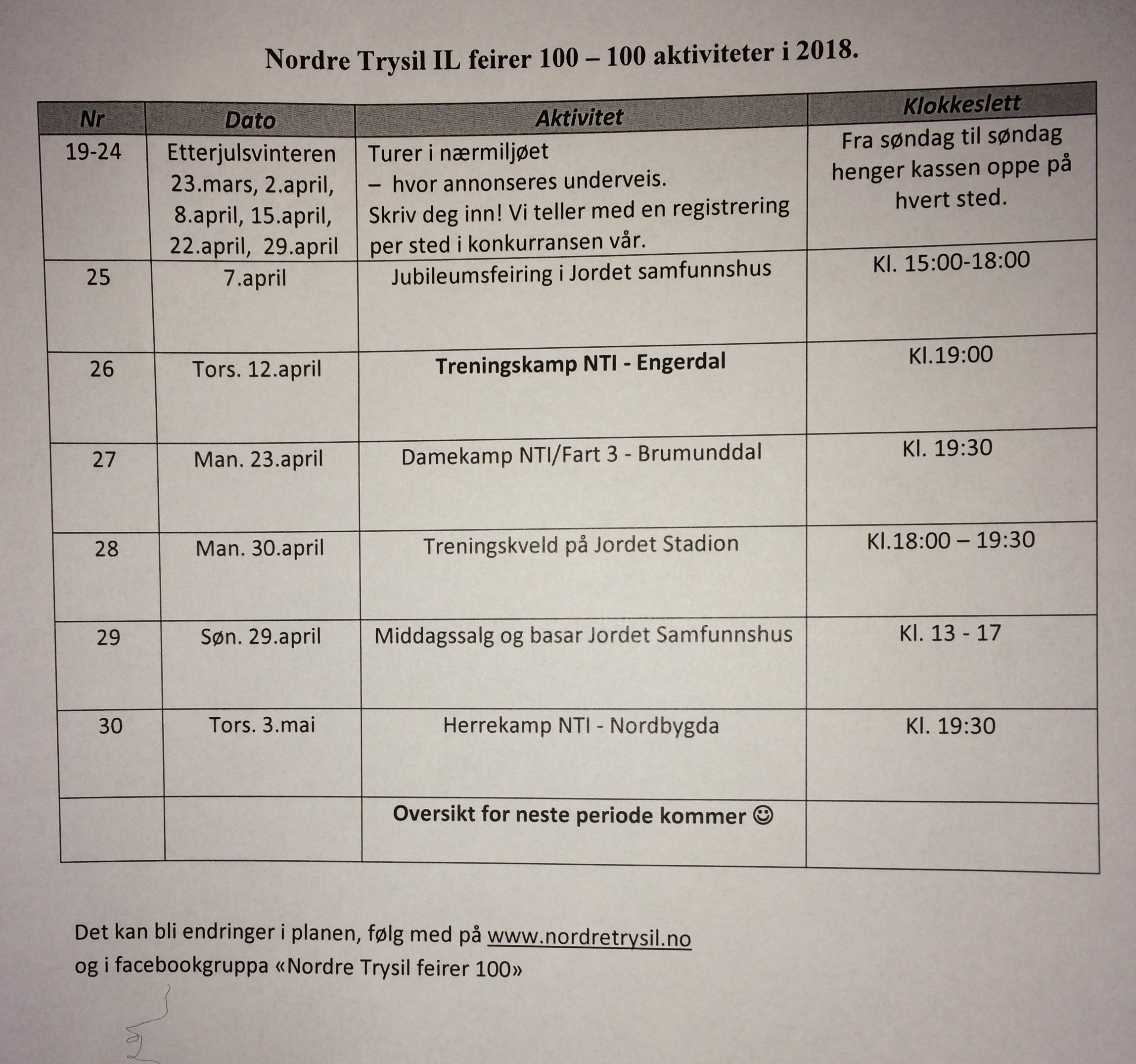 Her finner dere oversikt over de neste 11 aktivitetene, i perioden 23.mars - 3.mai. Nærmere informasjon kommer på Facebook, Instagram, plakatsøyla og her på nettsida ?