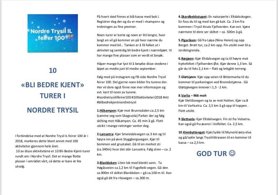 I forbindelse med at Nordre Trysil IL feirer 100 år i 2018, markeres dette blant annet med 100 aktiviteter gjennom hele året. 10 av disse aktivitetene er 10 Bli-Bedre-Kjent-turer rundt om i Nordre Trysil. Det er mange flotte plasser i området vårt, så dette er bare et lite utvalg.
