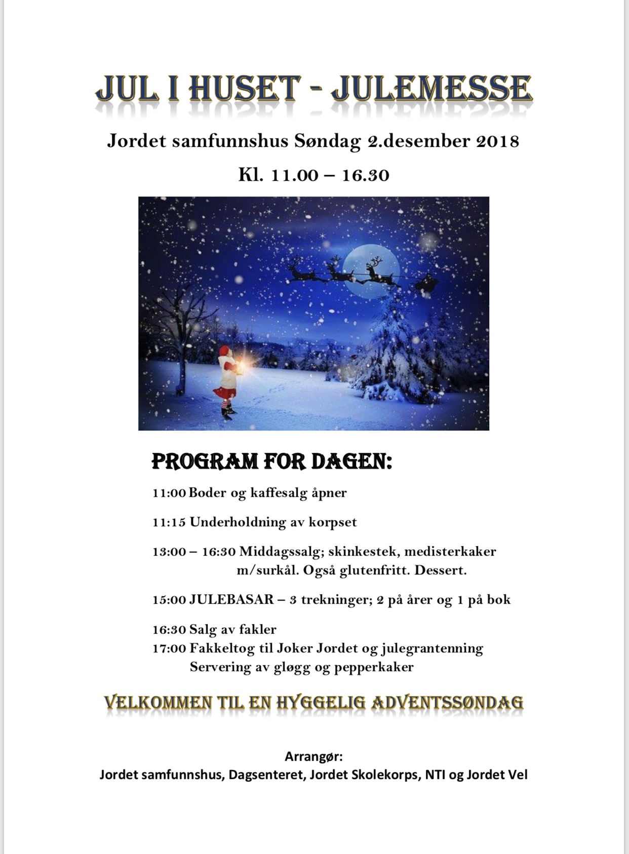 NTI, Dagsenteret, Jordet skolekorps, Jordet Vel og Jordet samfunnshus ønsker igjen velkommen til sitt felles julearrangement "Jul i huset" i Jordet samfunnshus første søndag i advent - 2.desember kl.11:00-16:30.